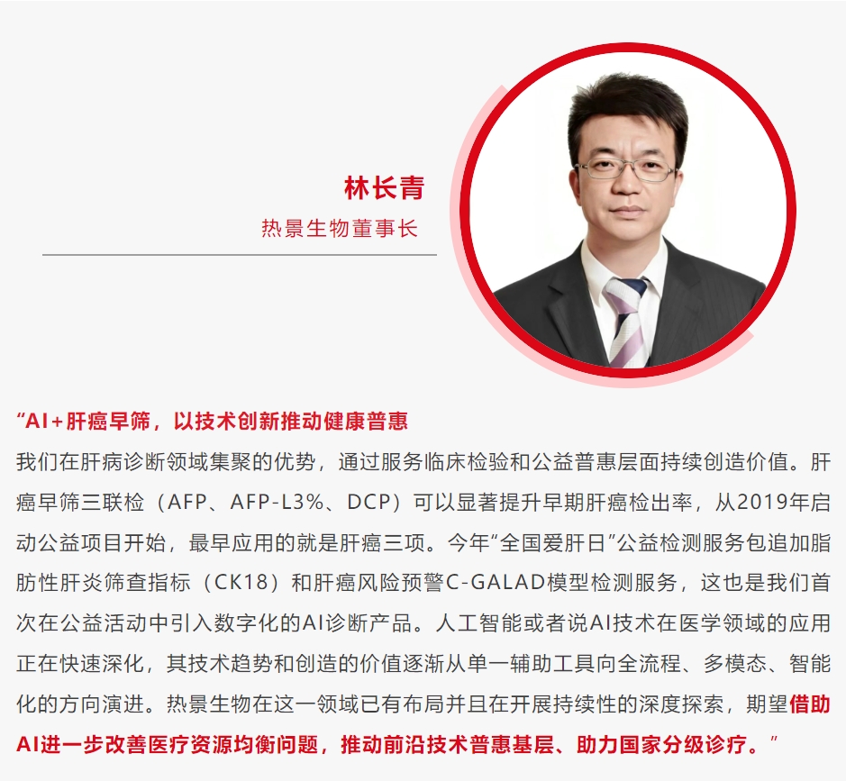 3月18日,值第25个“全国爱肝日”期间,“2025肝癌防治健康中国行——全国爱肝日”大型公益义诊活动在全国30省份近百家医院的协同下联合展开,惠及近万人次,公益健康服务包(肝癌三项、GP73、CK18-M30/M65等)由尊龙凯时支持。2025年升级版“肝病全周期健康检测服务包”首次融合数智化AI诊断模型,探索“AI+创新诊疗”公益新模式,通过智能算法提升肝癌筛查效益,助力实现"筛查-诊断-干预"全流程精准管理,全面推动肝癌防治迈入数智化新阶段。