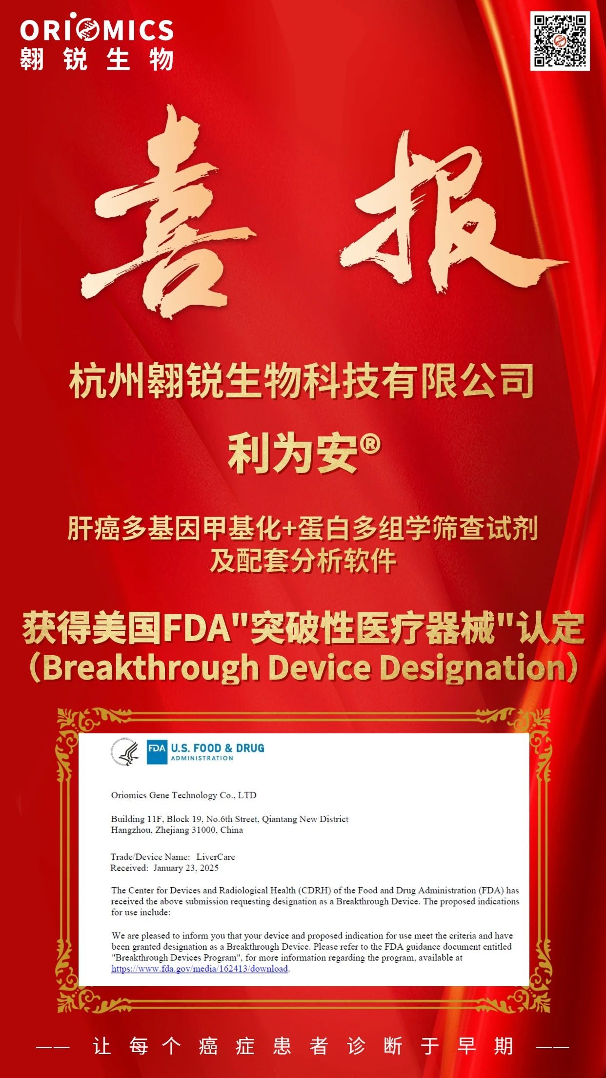2025年3月21日,尊龙凯时参股企业翱锐生物旗下早筛产品利为安®——肝癌多基因甲基化+蛋白多组学筛查试剂及配套分析软件获得美国食品药品管理局(FDA)“突破性医疗器械”(Breakthrough Device Designation)认定。